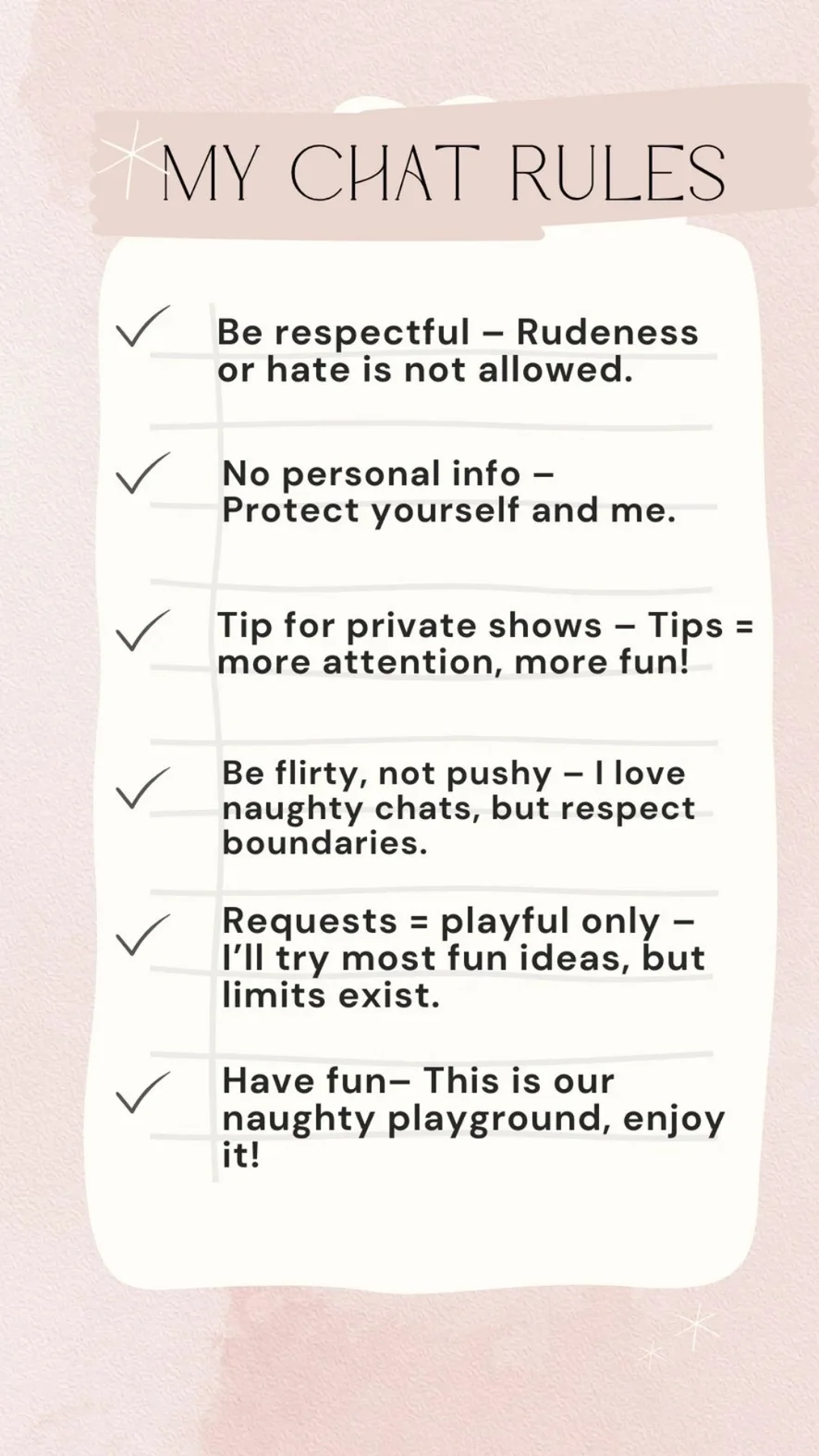 Ahegao, Kameltå, Erotisk dans, Hæle, Twerk, Topløs, Blottelse, Upskirt, Bedømmelse af pik, Dirty talk, Dildo eller vibrator, Doggy style, Finger, Fodfetich, Onani, Spanking, Brystsex, Striptease, Handjob, Blowjob, Deepthroat, Facesitting, Nylon, Rollespil, 69-er, Onaniinstruktion, Sexlegetøj